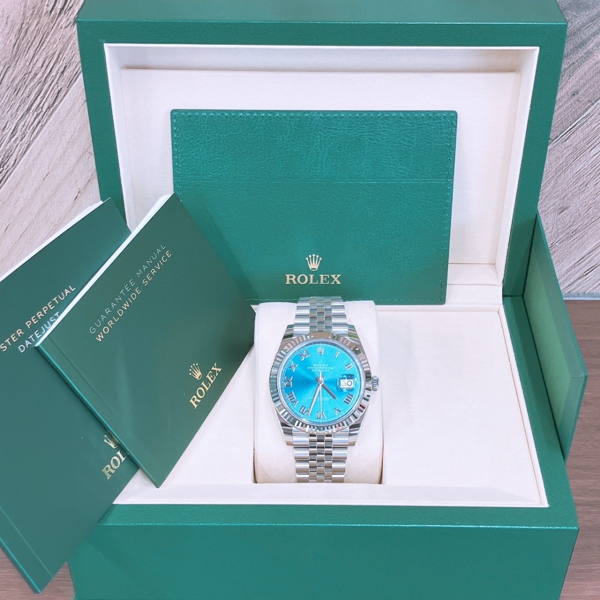 今回お買取りさせていただいたデイトジャストのブルー文字盤は、シンプルだけど存在感バッチリの定番モデル。