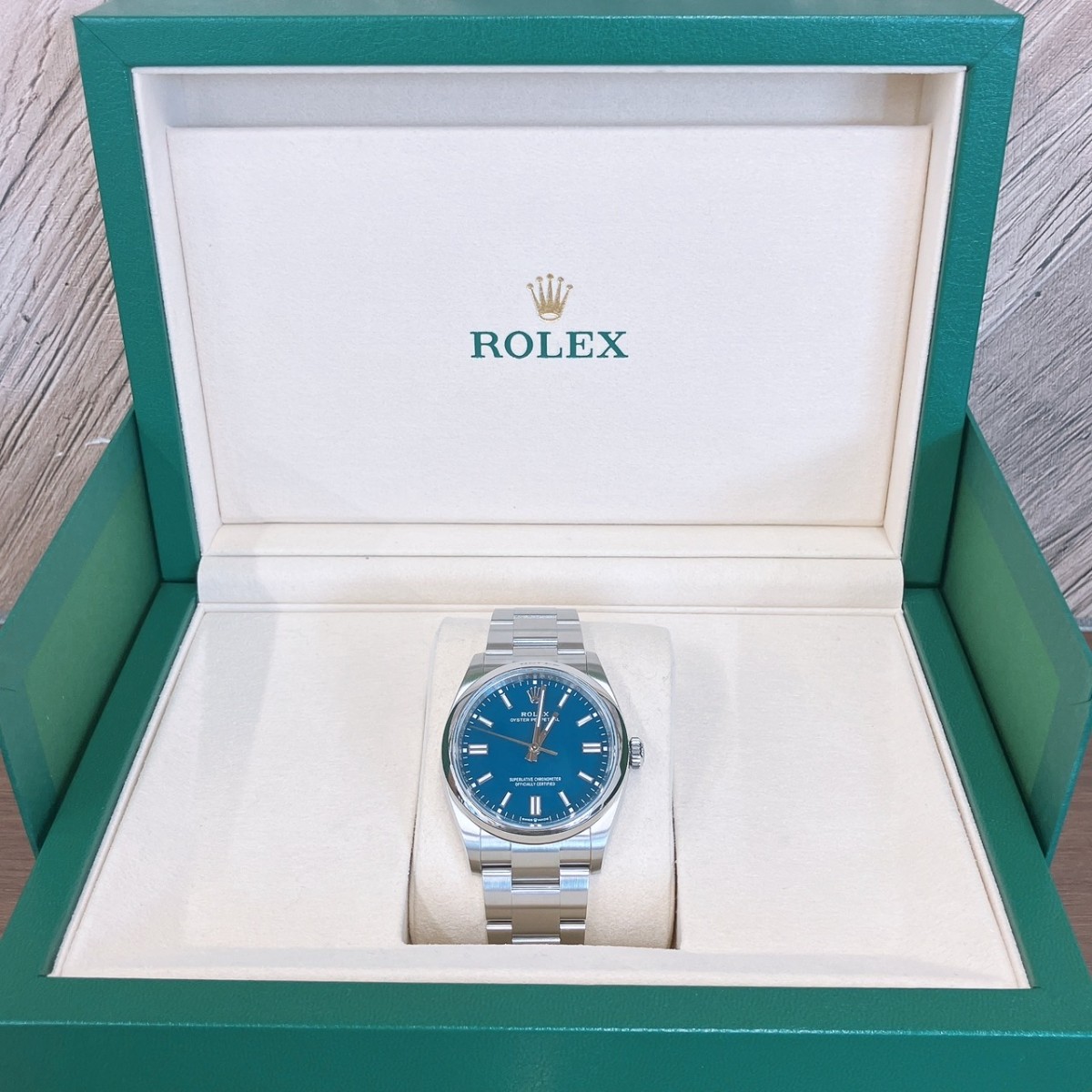 126000は、クラシックなオイスターデザインを継承しつつ、現代的な感覚で仕上げられたモデルです。ケースサイズはシンプルで扱いやすい36mm、日常に馴染みやすい大きさでありながら、しっかりとした存在感があります。中でも青文字盤は爽やかで視認性が高く、光の当たり方によって豊かな表情を見せる点が魅力です。文字盤の色味が、シンプルなデザインに洗練されたアクセントを加えています。