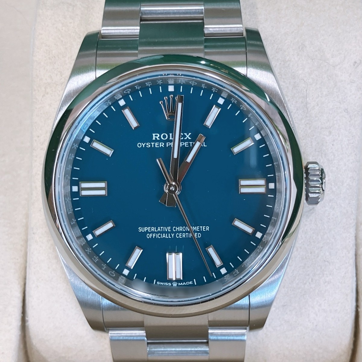 <p start="196" end="385">126000は、クラシックなオイスターデザインを継承しつつ、現代的な感覚で仕上げられたモデルです。ケースサイズはシンプルで扱いやすい36mm、日常に馴染みやすい大きさでありながら、しっかりとした存在感があります。中でも青文字盤は爽やかで視認性が高く、光の当たり方によって豊かな表情を見せる点が魅力です。文字盤の色味が、シンプルなデザインに洗練されたアクセントを加えています。</p>