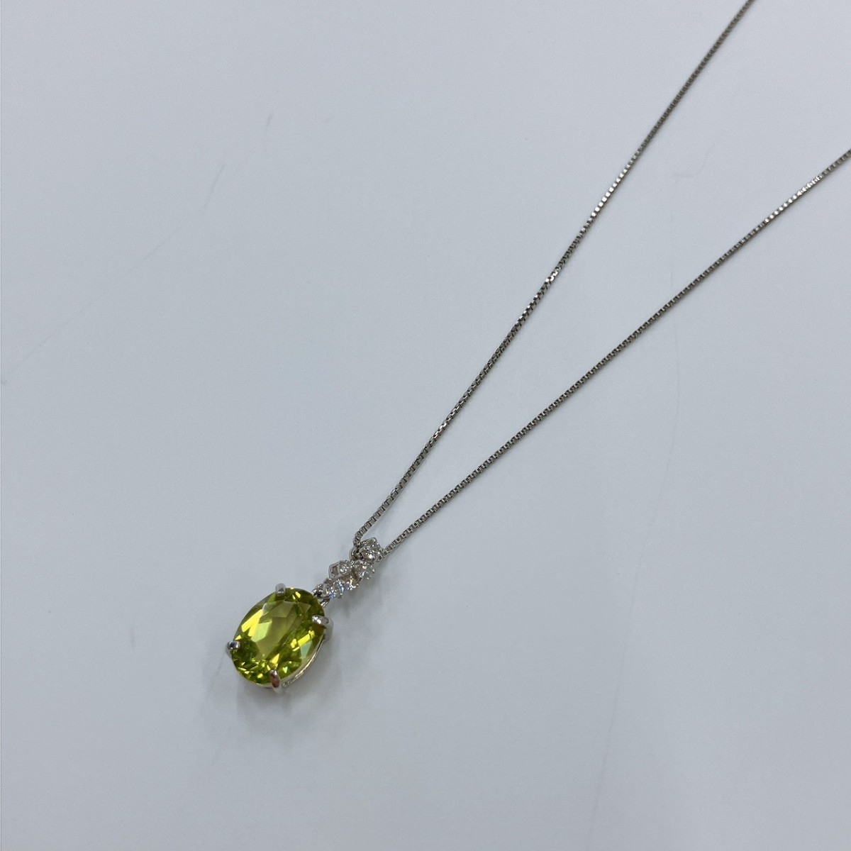 - <div>ご覧いただきありがとうございます。</div><div>おたからや小倉中津口店の相原です!</div><div>今回買取させていただいたお品物はPt850 メレダイヤ付きネックレス です!</div><div>ありがとうございます!</div><div><br></div><div><p node="1">ペリドットは、古代エジプトでは「太陽の石」として崇められ、夜の照明の下でも瑞々しい緑色が陰ることがないため「夜会のエメラルド」という別名を持つ宝石です。今回お持ち込みいただいたお品物は、その特徴であるオリーブグリーンの発色が非常に美しく、内包物の少ない透明度の高いルースが使用されています。ペリドット特有の複屈折という性質により、光が入ると石の内部で光が二重に屈折し、力強い輝きを放っているのが印象的です。</p><p node="2">地金には純度の高いPt900(プラチナ900)が使用されており、その重厚な銀白色の光沢が、ペリドットの爽やかなグリーンをより一層引き立てています。プラチナは変色や変質の心配が極めて少ない貴金属であるため、日常使いからフォーマルな席まで、長く愛用できる点が魅力です。また、メインストーンの周囲やラインに配置されたメレダイヤモンドは、小粒ながらも一石一石が丁寧にセレクトされており、プラチナの土台の上で細やかな火花を散らすような輝きを添えています。</p> <br></div>